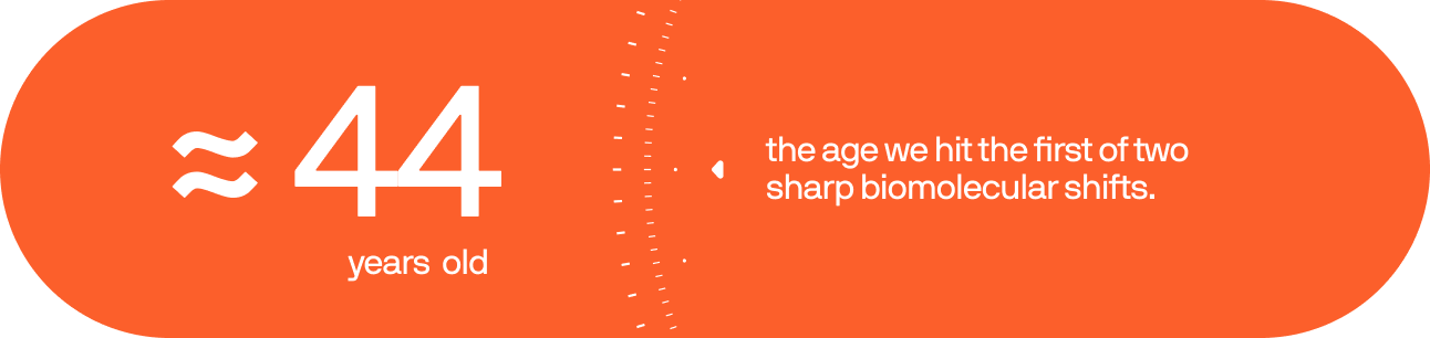 New research in Nature Aging shows aging isn’t a steady decline but occurs in two sharp biomolecular shifts — the first around age 44 and the second around age 60 (PMID: 39143318).