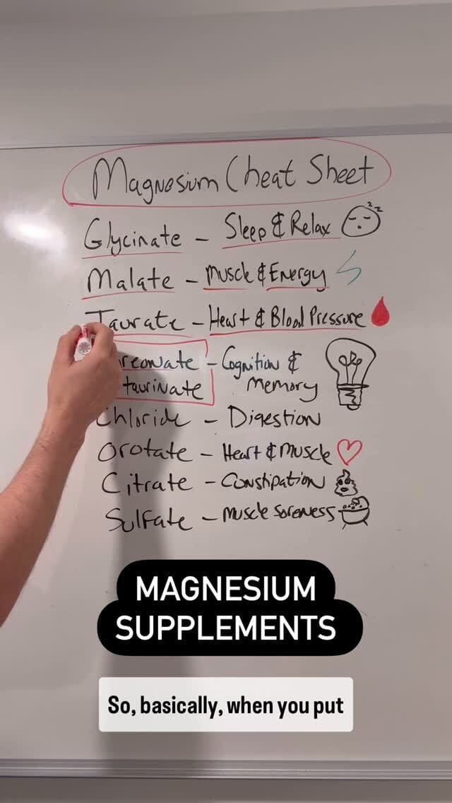 Lucky for us friend of Superpower Dr. James DiNicolantonio got out his whiteboard marker to create a “Magnesium Cheat-Sheet,” breaking down the key differences between glycinate, malate, taurate, threonate, acetyl-taurinate, chloride, orotate, citrate, and sulfate (yeah, there’s a lot of them).